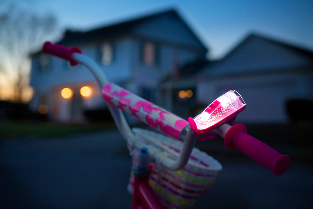 Beep! Beep! Ride in style with this LED light-up bike horn that twinkles as it changes colors and easily mounts to your handlebars. They'll know you've arrived when they hear one of twelve fun sounds, like a traditional honk, a revving motorcycle engine, or even a moo-ve over cow sound. Includes 1 light-up horn and mounting strap. Weather-resistant. 2 AAA batteries included.